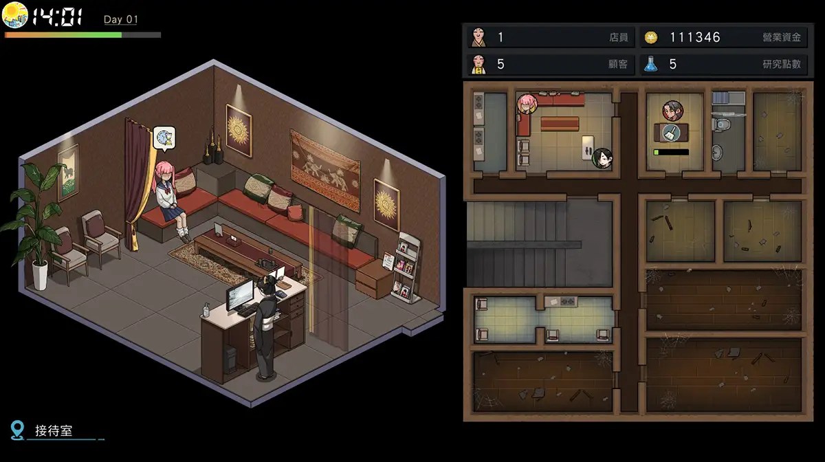 由制作备受好评的【護身術道場】的公司制作的新游戏,游戏非常有意思,拥有丰富要素的模拟经营类游戏。 主角是一个黑社会成员,目前面临晋升考验,要在30天内赚够1000万日元。 玩家将在白天管理经营店铺,夜晚走上街头拉客宣传。当然你也可以选择在夜晚时间放松一下和其他女主角约会